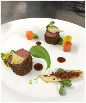 Our first course, the beetroot carpaccio began its voyage to our plates yesterday. The chefs in the salad kitchen created the filo pastry stuffed with herbed feta cheese, a tangy delight. They delicately sliced and layered the beets with Aspic infused with lemon grass and aromatic limes leaves and prepared the sauces we enjoyed tonight.