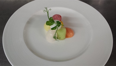 To exit the fish taste , the Passion fruit Sorbet was introduced with a Mojito-mint flavored syrup , on a plate that’s similar to the first soup plate as a sign for a restart.