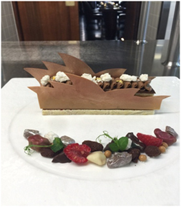 Our main course of Angus Beef tenderloin and Kuwaiti jumbo shrimp was a delicious surf and turf entrée. It may look simple on the plate, but it is deeply complex. Angus beef is used because of its delicate marbling, meaning that you can cook it past medium rare and it will remain succulent. We always want more sauce and the demi-glace itself took 24 hours to make from beef bones and vegetables, garlic, tomato, leaks and thyme. Garnished with porcini mushroom sauce, it was a rich taste sensation.