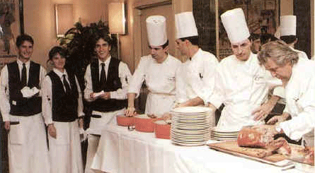 The staff responsible for preparing and serving the dinner should be invited into the dining room at the end of the event (usually after the last or dessert course is served) to be recognized and thanked. The Chef is usually asked to introduce the kitchen staff, and the Maitre d' or Captain is asked to introduce the waitstaff. In situations in which the Owner, General Manager, Food and Beverage Manager, or others in management are present, they should be invited to come forward to join those being thanked.